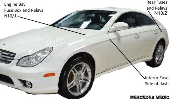 Mercedes-Benz models such as CLS500, CLS550, and CLS55 AMG have fuse boxes in several locations. There are three main fuse panels and several pre-fuse boxes.