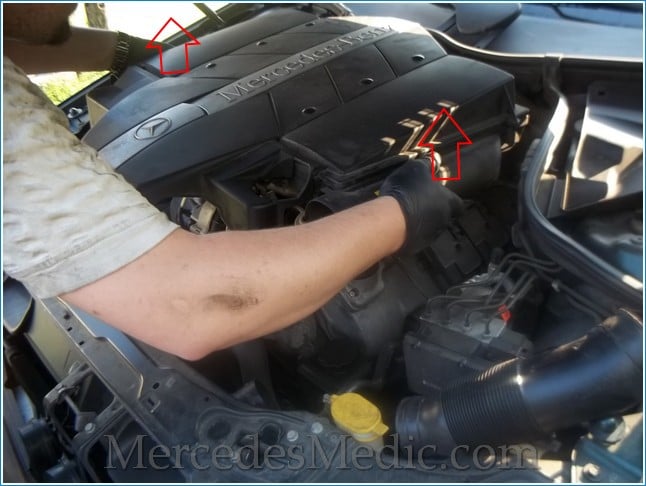 - Locate the engine cover. Grab it on the sides and lift it. The whole engine cover is held in place with four clips. The cover comes off with pressure—no need to remove any screws other than the air ducts.