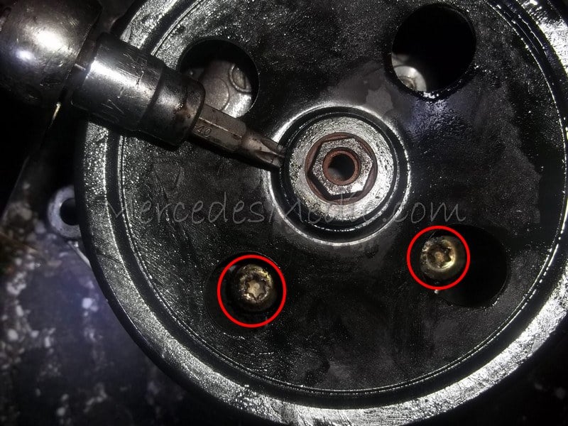 Remove the two E Torx bolts on the front of the power steering pump.