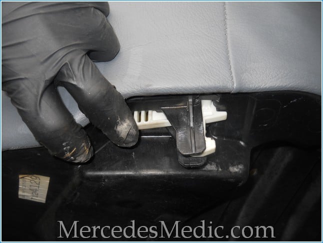 - Remove the rear seat cushion. To remove it, you must press on the lock mechanism below. Place your hand under the seat at the corner of the cushion. Do this for both corners. Here is a picture of what you must press to release the seat cushion.