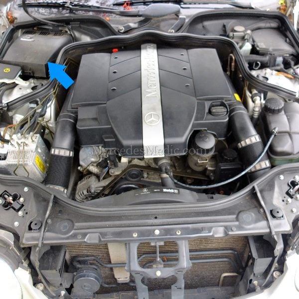 Locate the hood release under the dashboard on the driver’s side, next to the brake pedal. Open the hood by pulling on the hood release. open hood mercedes benz release