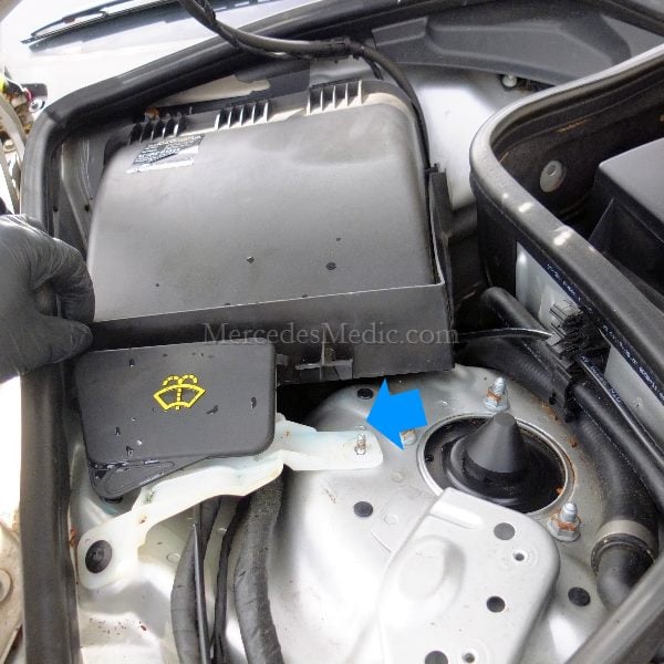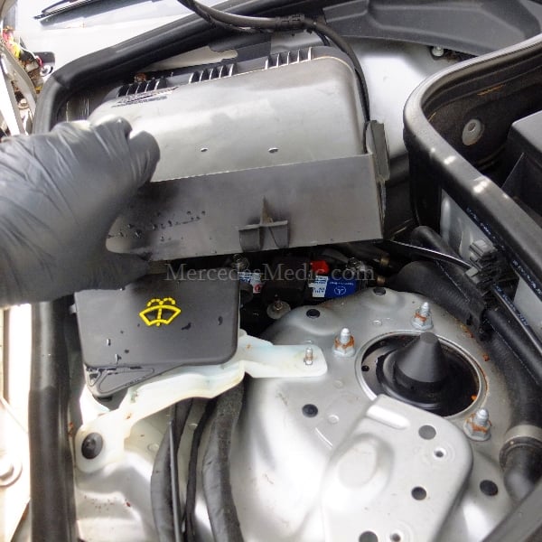 Once you locate the cabin air filter in the engine bay compartment, remove the 10 mm plastic nut on the front of the cabin air filter housing. Be careful not to break the plastic tab. change-replace-cabin-air-filter-mercedes-benz-02
