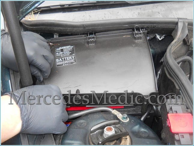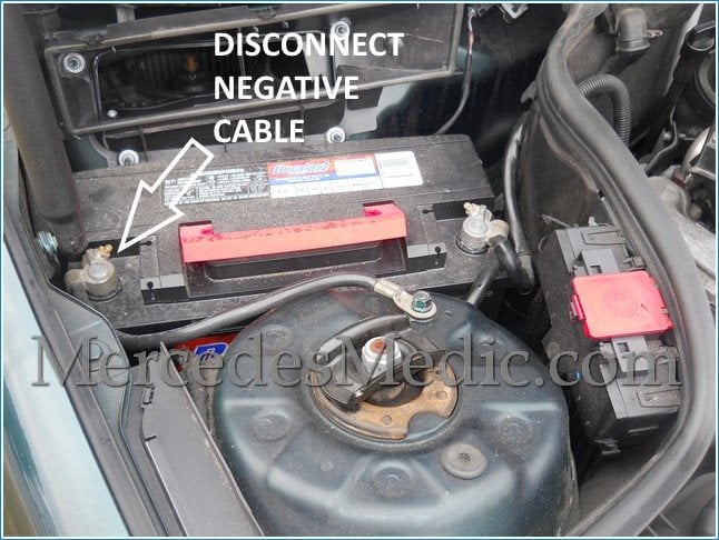 - Disconnect the NEGATIVE terminal from the battery. HINTS: Locating the battery. If you have a C / E / CLK class, it could be either in the engine bay compartment, under the rear seats, or in the trunk. We are working on a C Class W203 2001-2007; the battery is in the engine bay. First, we need to remove the cabin air filter housing. Push up the 3 clips in the picture below and pull out the housing.