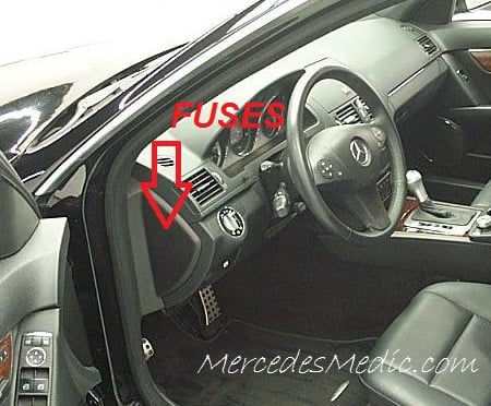 Location of fuses for Mercedes Benz C Class W204,  years 2008 to 2015, models C180 C200 C250 C300 C350 C63 AMG