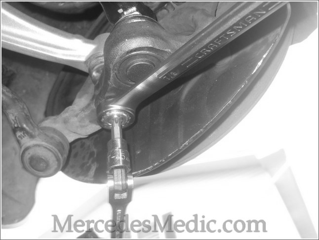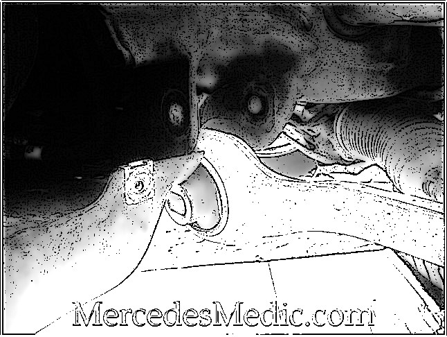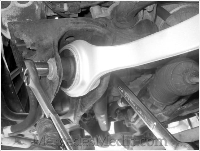 Remove the nut at the steering knuckle and press the radius rod out of the steering knuckle. - Remove the nut from the bolt where the control arm/torque strut connects to the frame. You will have to counter-hold the bolt on the backside.