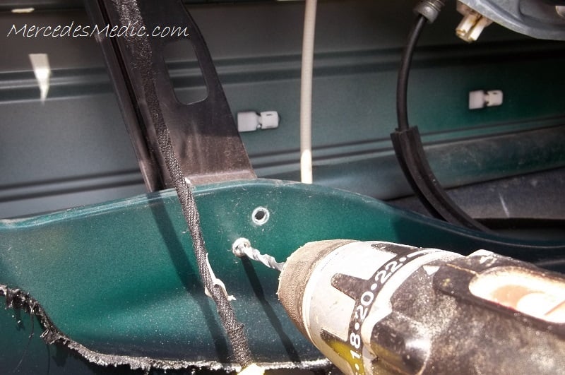 Drill out one rivet near the door pull handle. It holds the window regulator in place. It is part of the door pull handle. It’s the one further to the back from the 3 or 4 rivers that are part of the door handle.- Drill two rivets on the bottom, each side of the window regulator.