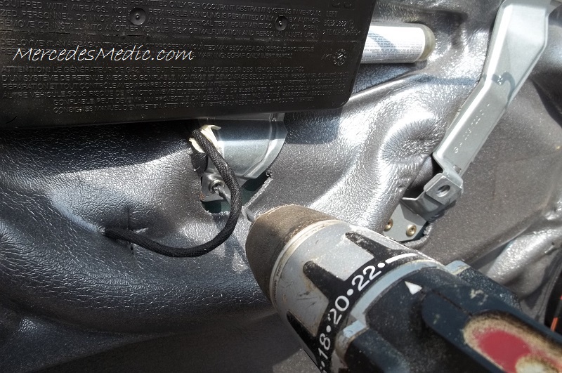 - Drill out the bottom rivet for the airbag. As shown in the picture, you can drill out the upper airbag rivets or just the bottom one and fold up the airbag. Whatever you feel comfortable with.