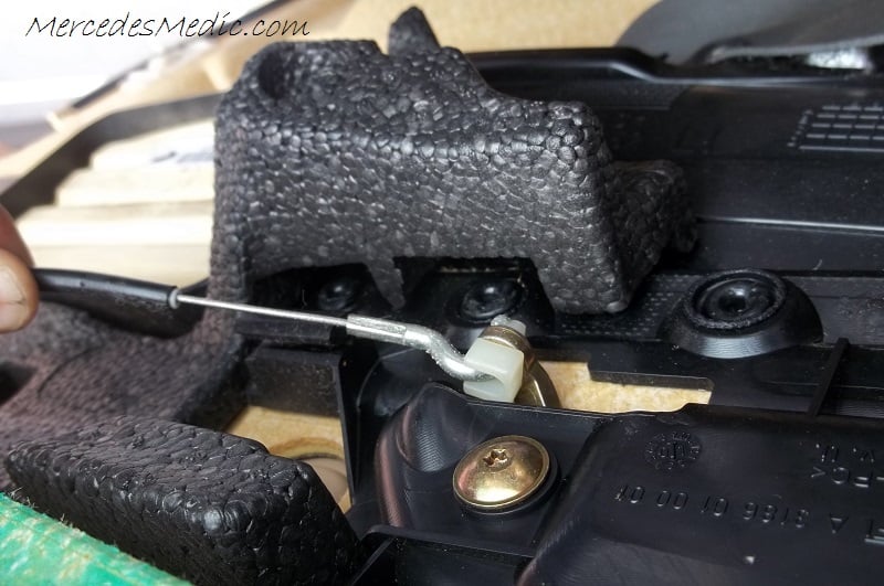 - Next, remove the door latch cable. Pull the black cable back to remove it from the bracket. Then pull the hook up.