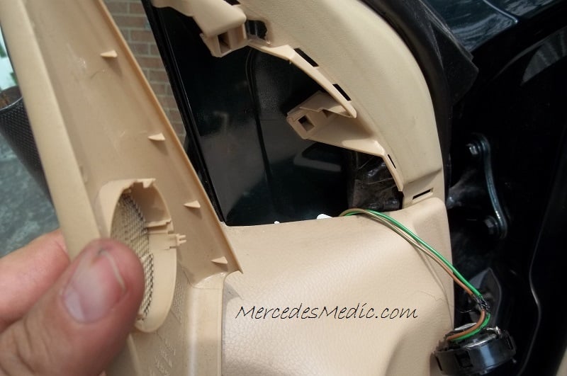 - Remove the triangle speaker cover. You push the cover toward the front of the car while pulling it away from the door simultaneously.