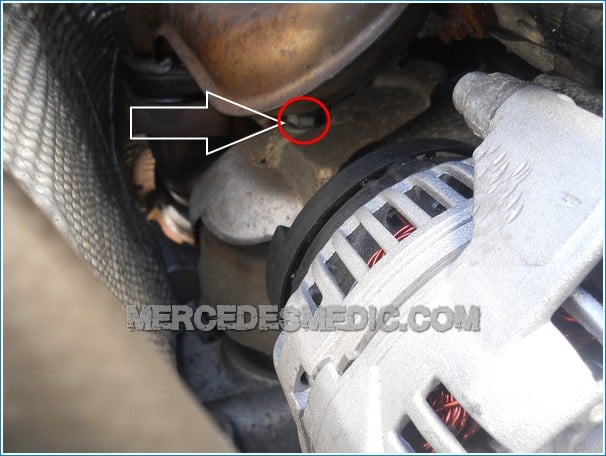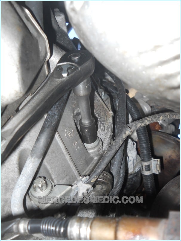 9. Remove the 16 mm bolt on top of the engine mount. It is located under the exhaust, so it will be difficult to see the top of the bolt, but having the proper wrench turns this task from almost impossible to easy. mercedes benz starter replacement change 21