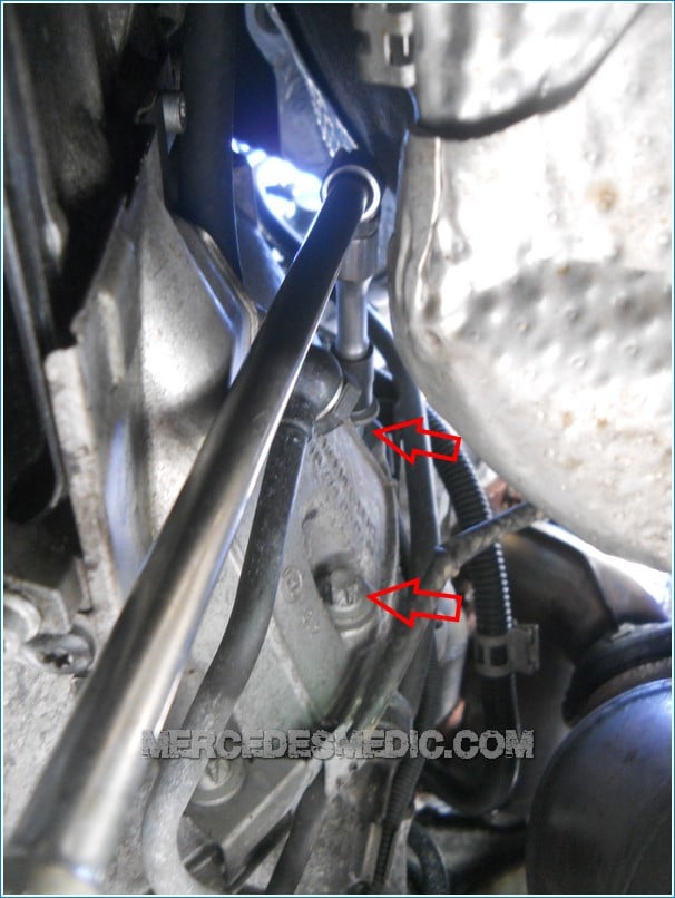 7. Remove the two starter bolts shown below. The upper bolt will be a little more challenging to remove but using 3/8 extensions and a 3/8 universal joint make the job a lot easier. mercedes benz starter replacement change 15mercedes benz starter replacement change 13