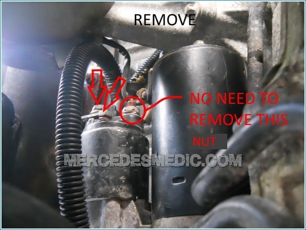 6. Disconnect the cable that feeds the +12 Volts to the starter. The bolt should be 10 mm. mercedes benz starter replacement change 19