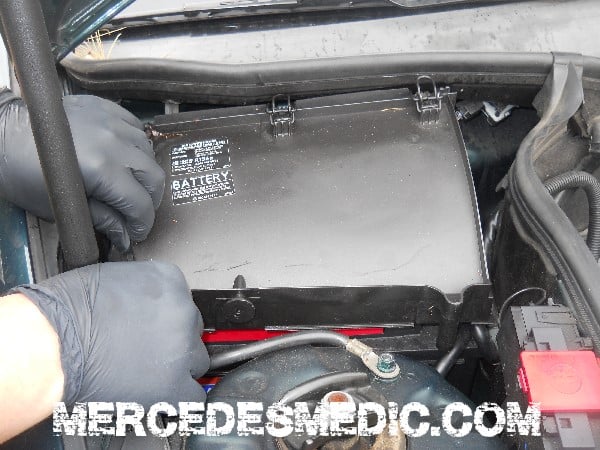 1. Open the hood and locate the battery under the cabin air filter. Tip: It is located on the passenger side. mercedes c class location of cabin air filter
